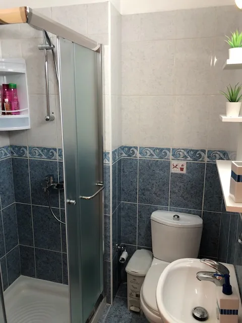 The apartment offers two bedrooms: a master double bedroom with a small sea-facing balcony, and a twin bedroom. Both bedrooms share a family shower room.